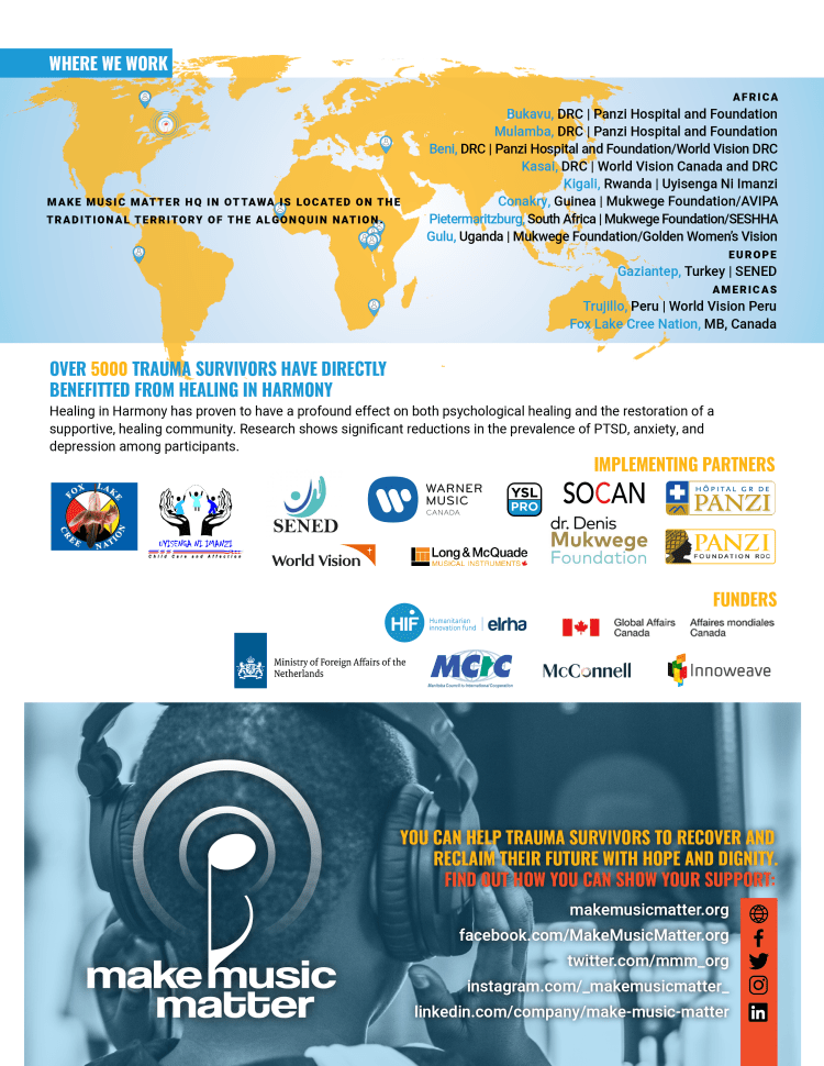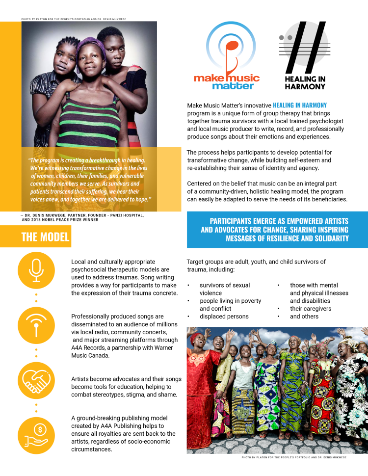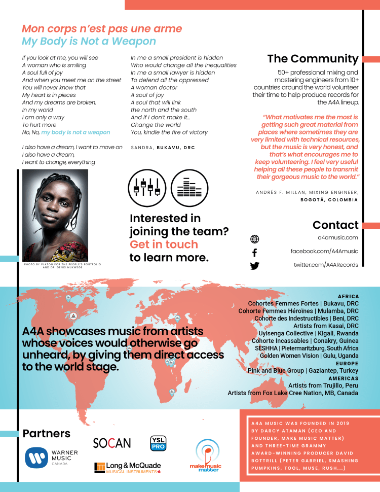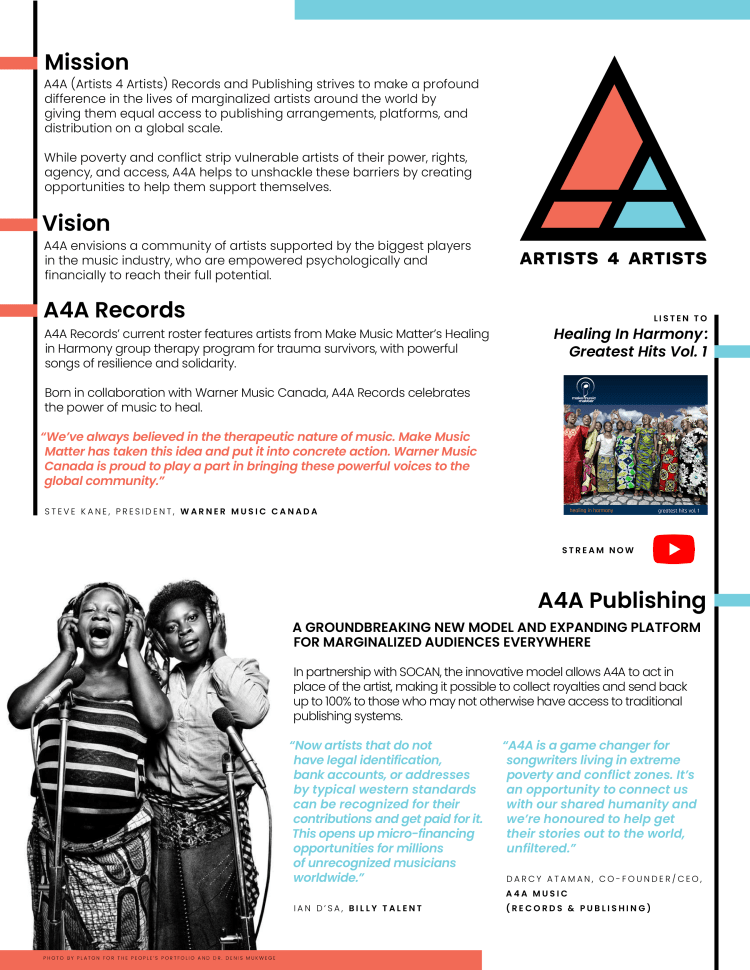 The task here was to design and lay out an eye-catching, on-brand, one-page promo piece to distribute via digital & print platforms. A4A Records works very closely with Make Music Matter, but it’s very important to each group that their branding remain distinct, unique, and consistent to each organization. Here’s an example of how applied use of colour palette, font selection, graphic embellishments, and page grids can be used to visually define a brand.